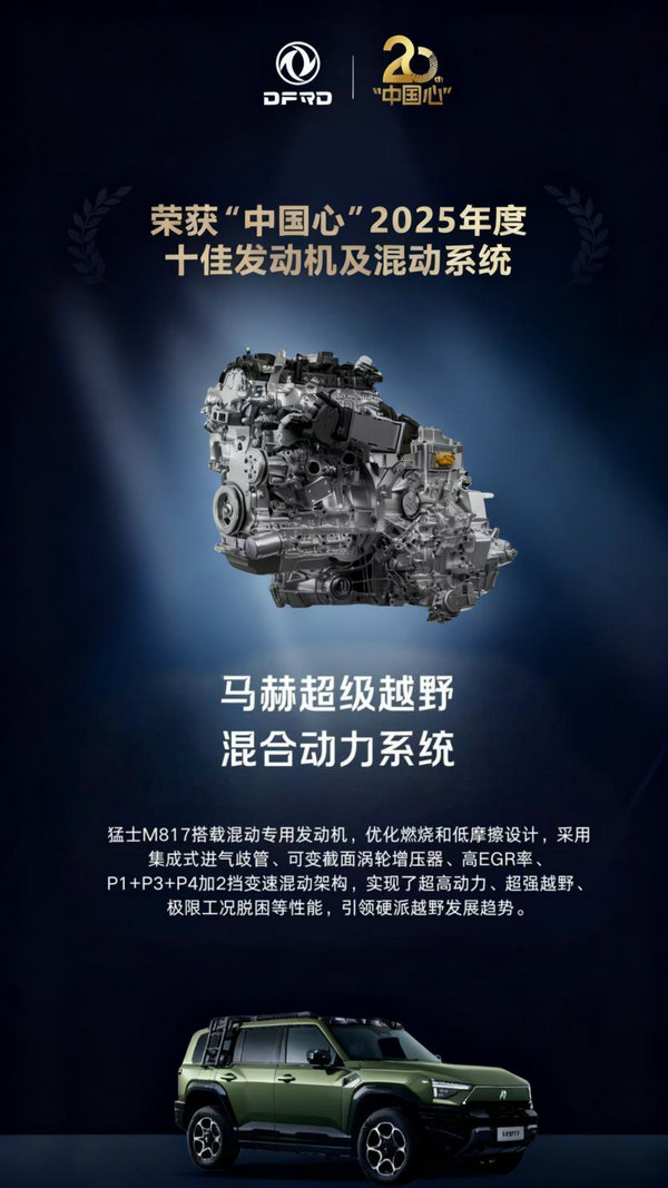 東風(fēng)自主動力再次迎來高光時刻。近日,“中國心”2025年度十佳發(fā)動機及混動系統(tǒng)評選結(jié)果揭曉,東風(fēng)汽車自主研發(fā)的馬赫超級越野混合動力系統(tǒng)斬獲“中國心”2025年度十佳發(fā)動機及混動系統(tǒng)大獎。這是馬赫動力自首次亮相以來,連續(xù)六年獲此殊榮,既彰顯了東風(fēng)汽車積淀深厚的技術(shù)功底,更標(biāo)志著中國品牌在新能源越野動力領(lǐng)域的技術(shù)突破與領(lǐng)先地位。