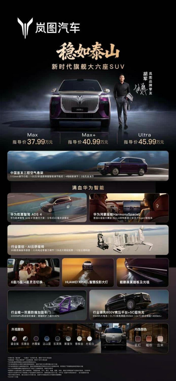 11月18日,嵐圖汽車在深圳國際會展中心召開以“爭峰”為主題的新車發(fā)布會,正式發(fā)布新時代旗艦SUV——嵐圖泰山,新車共推出Max版、Max+版、Ultra版、黑武士版四大版型,官方指導(dǎo)價為37.99萬元-50.99萬元。同時,還公布了總價值4.8萬元的上市權(quán)益。