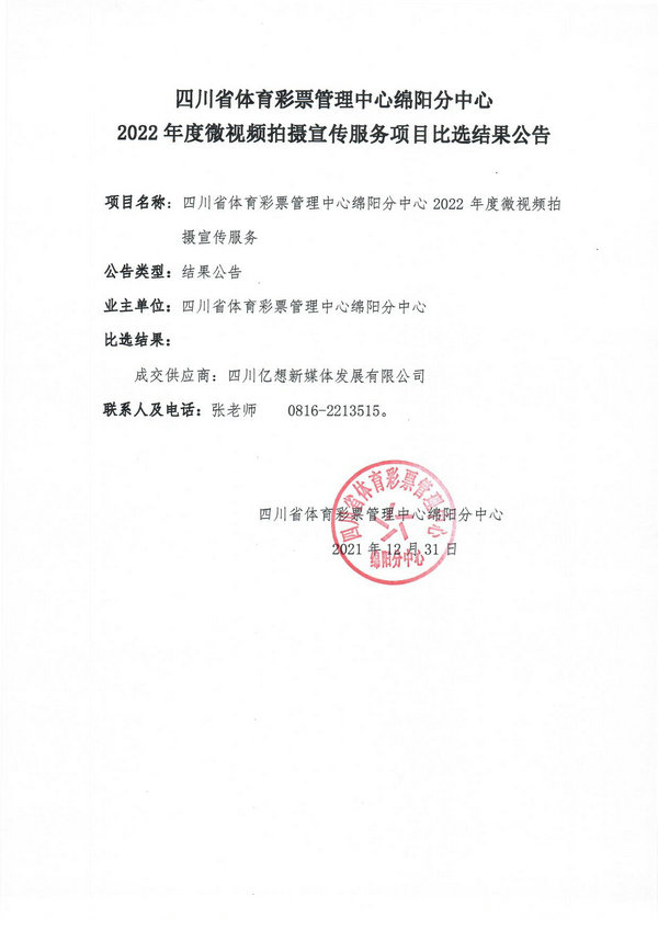四川省體育彩票管理中心綿陽(yáng)分中心2022年度微視頻拍攝宣傳服務(wù)項(xiàng)目比選結(jié)果公告