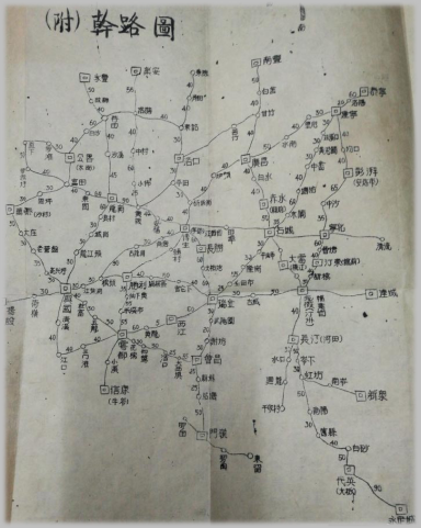 1933年11月中華蘇維埃共和國臨時中央政府內(nèi)務人民委員部發(fā)布的《中央政府修路計劃》所附干路圖。(資料圖片)