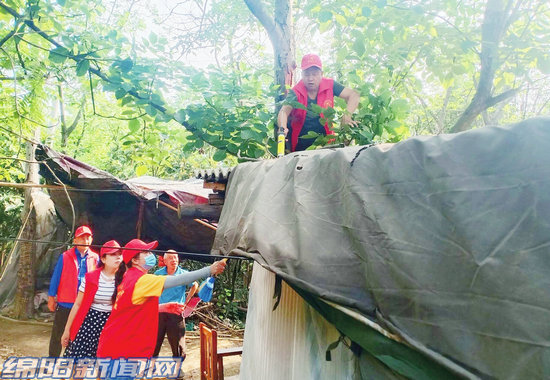 活動當(dāng)天,愛心志愿者一大早就來到賴成德老人家里。由于老人獨身一人居住在位于山區(qū)的瓦房里,因年久失修,每年夏天都面臨屋頂漏水的煩惱。社區(qū)志愿者得知情況后,第一時間組織大家為老人修繕房屋(如圖),確保雨季老人的人身安全。