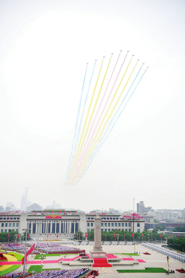 7月1日上午,慶祝中國共產(chǎn)黨成立100周年大會在北京天安門廣場隆重舉行。這是大會開始前的飛行慶祝表演。?。ㄐ氯A社記者 李濤 攝)