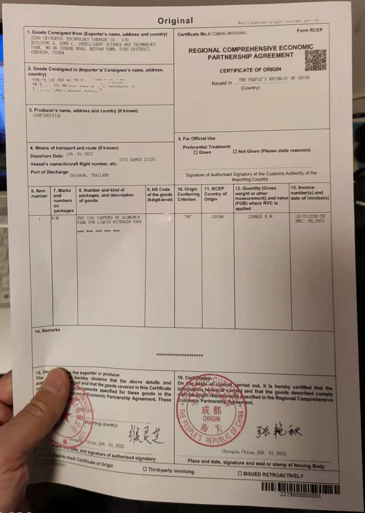 比四川富民化工有限公司動作快一步,就在1月1日零時10分,零度低溫科技(成都)有限公司出口泰國的一批鋁制罐,已經(jīng)通過網(wǎng)上渠道在成都海關所屬錦城海關申領到了RCEP原產(chǎn)地證書,這也四川落地的首份RCEP原產(chǎn)地證書。