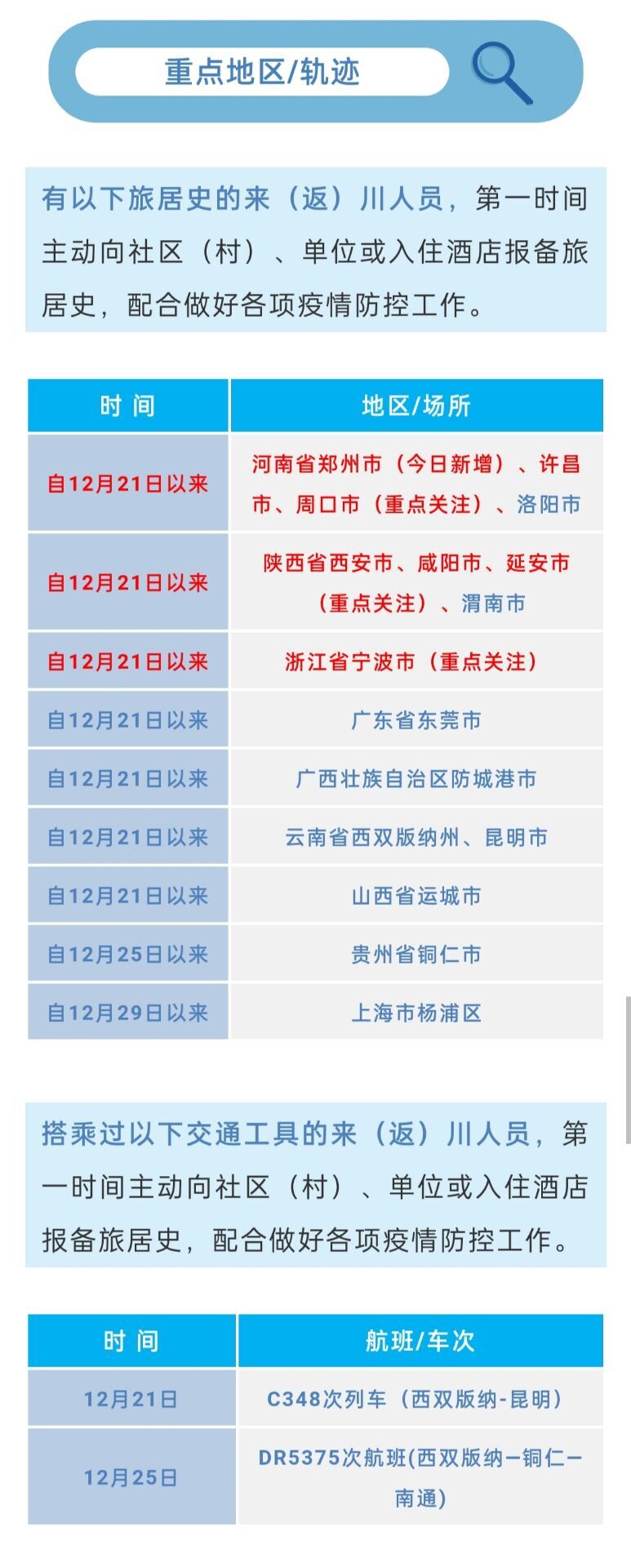 三是1月4日新增對(duì)12月21日以來(lái),有河南省鄭州市管城回族區(qū)、二七區(qū),周口市太康縣旅居史的入(返)川人員實(shí)施居家或集中隔離,每3天進(jìn)行1次核酸檢測(cè),直至離開旅居地滿14天為止。