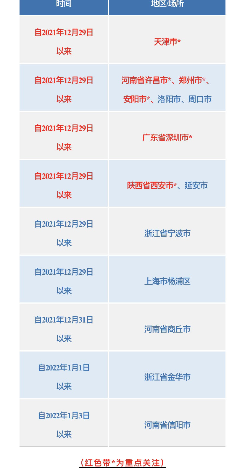 1隨時(shí)關(guān)注國(guó)內(nèi)新冠肺炎疫情變化情況,近期重點(diǎn)關(guān)注天津市,河南省安陽(yáng)市、許昌市、鄭州市,陜西省西安市,廣東省深圳市疫情,不前往高、中風(fēng)險(xiǎn)地區(qū)以及發(fā)生本土疫情的地區(qū)。如您近期有疫情地區(qū)旅居史,收到提醒短信或健康碼變?yōu)?ldquo;黃碼”,請(qǐng)立即向所在社區(qū)(村)、單位或入住酒店報(bào)備旅居史,按要求做好核酸檢測(cè),配合做好隔離管控措施。