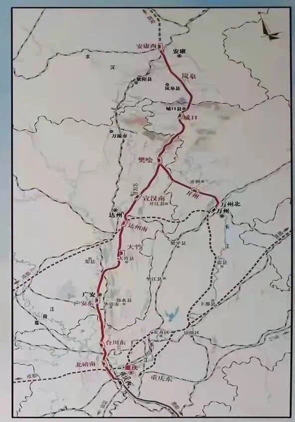 項目起自在建西安至安康高速鐵路安康西站,經嵐皋、城口、宣漢、達州、大竹、廣安、合川、北碚,至重慶樞紐重慶西站,線路全長477.9公里(其中新建線路446.7公里),設11座車站;同步建設樊噲經開州至萬州連接線,長90.2公里,設3座車站。配套新建本線至蘭渝鐵路、襄渝鐵路、成達萬高鐵聯(lián)絡線約26公里。