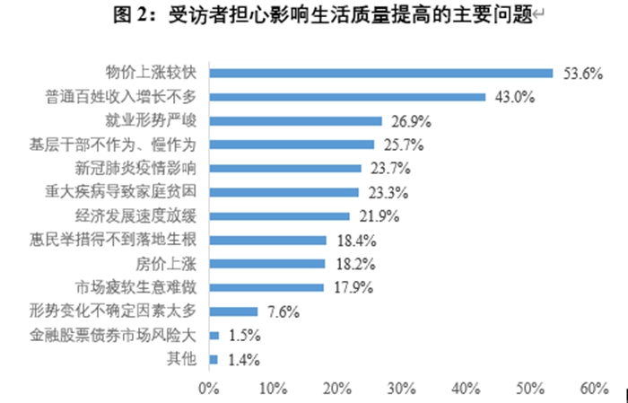 當(dāng)問及受訪者2022年最擔(dān)心影響生活提高的主要問題時(shí),選擇“物價(jià)上漲較快”的比例最高,為53.6%;其次是“普通百姓收入增長不多”,為43.0%。