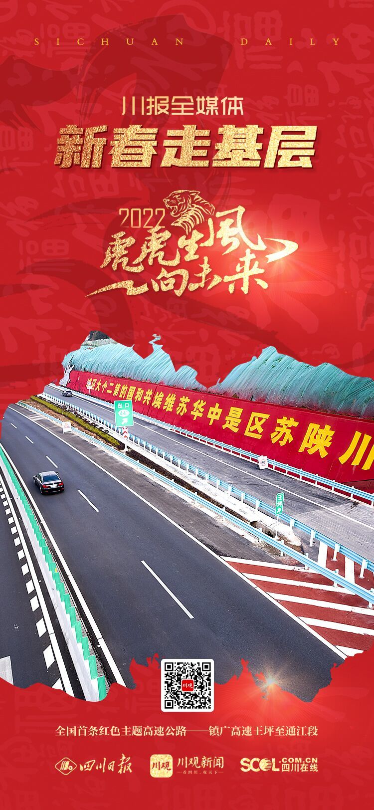大約1小時,車輛到達巴萬高速與鎮(zhèn)廣高速王通段交匯處。本來已有些睡意,但當(dāng)車由匝道駛?cè)腈?zhèn)廣高速王通段,一幅以紅色為底色、紅軍舉旗向前的巨幅圖像直沖眼簾,讓人一下來了精神:紅色主題高速到了。