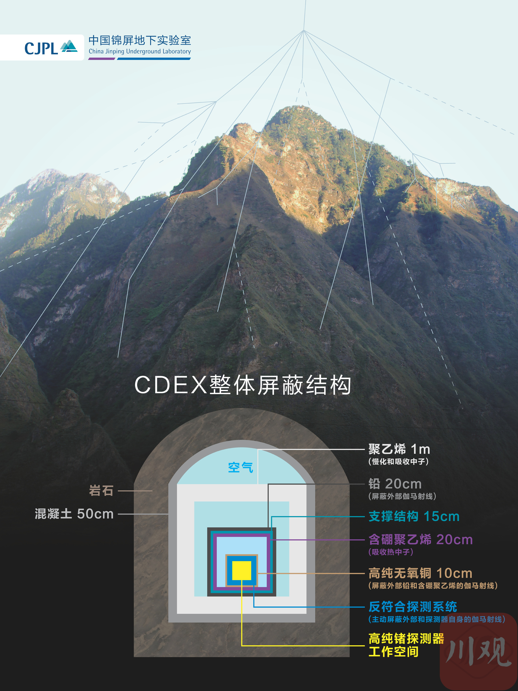 清華大學工程物理系首席研究員岳騫介紹,中國錦屏地下實驗室隱藏在山體下,巨大的巖層成為宇宙線的天然屏障,可以屏蔽大量的宇宙線粒子。但這還不夠,為了進一步去掉干擾物質,這個神秘空間設置了重重的防護“盔甲”。