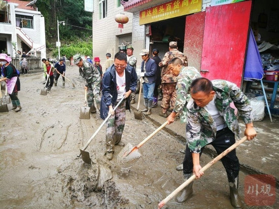 羅從兵(中)曾和群眾一起清理受泥石流影響的街道。(金川縣融媒體中心供圖)