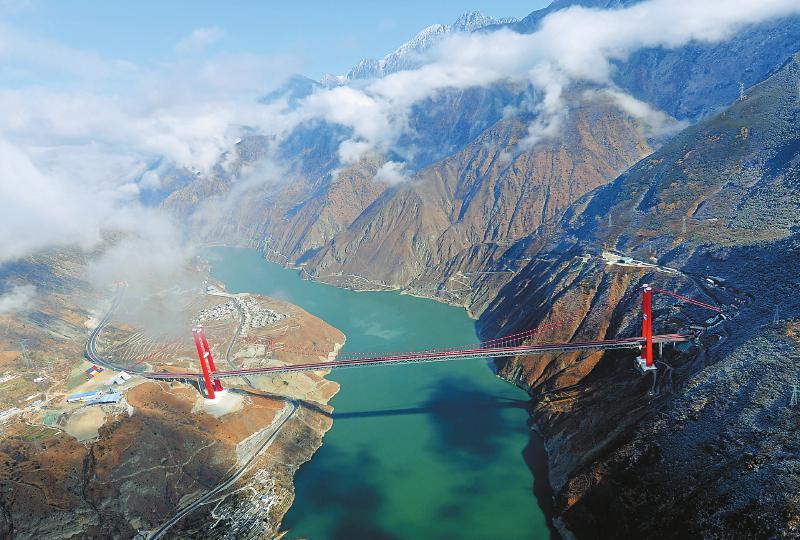 2019年2月11日,鳥瞰雅康高速瀘定大渡河大橋,大橋是一座建設(shè)在高海拔、高地震烈度帶、復(fù)雜風(fēng)場及溫度場環(huán)境下的超大跨徑鋼桁梁懸索橋,全橋長1411米,主跨1100米,橋面至大渡河水面239米,被譽(yù)為“川藏第一橋”。
