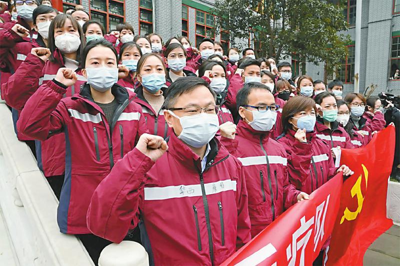 共產(chǎn)黨員發(fā)揮先鋒模范作用,黨旗在抗疫斗爭第一線高高飄揚(yáng)。圖為2020年2月,四川大學(xué)華西醫(yī)院援鄂醫(yī)療隊(duì)在出征儀式上宣誓。