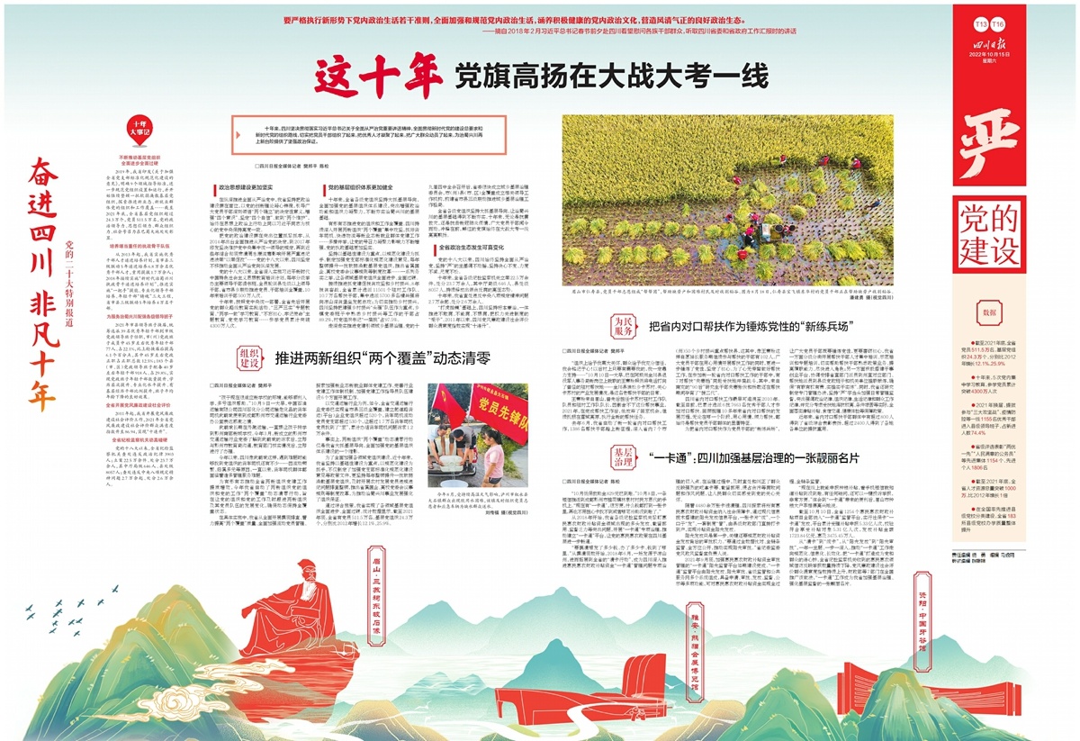 十年來,四川堅決貫徹落實習(xí)近平總書記關(guān)于全面從嚴(yán)治黨重要講話精神,全面貫徹新時代黨的建設(shè)總要求和新時代黨的組織路線,切實把黨員干部組織了起來,把優(yōu)秀人才凝聚了起來,把廣大群眾動員了起來,為治蜀興川再上新臺階提供了堅強政治保證。