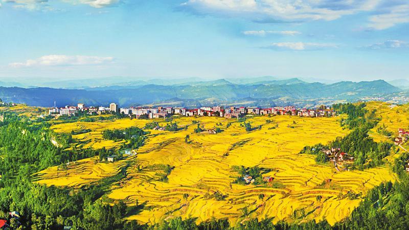 遠眺達州市通川區(qū)金石鎮(zhèn)高山優(yōu)質(zhì)稻基地,錯落有致的民居與連綿起伏的稻田相映,一幅生機盎然的美麗鄉(xiāng)村畫卷徐徐鋪展。 達州市通川區(qū)委宣傳部供圖