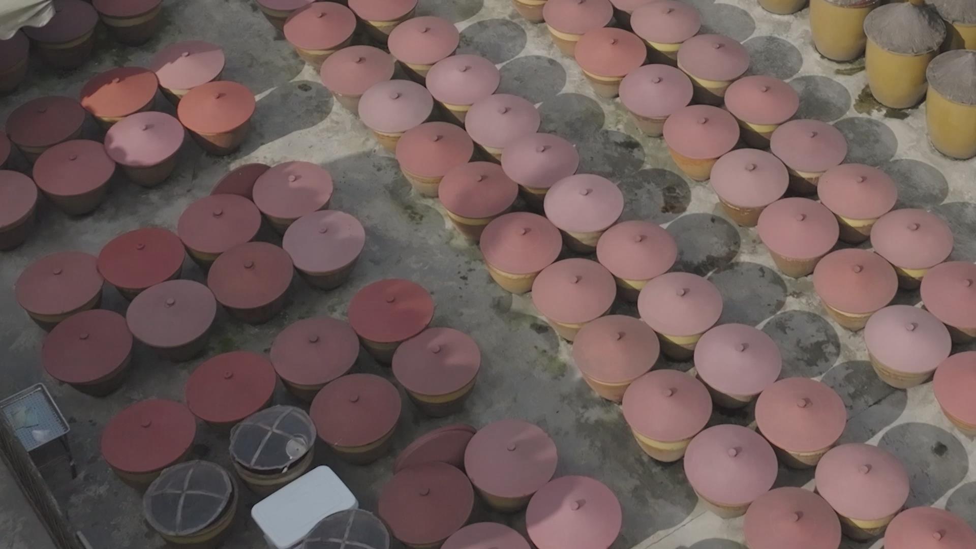 戰(zhàn)旗村醬園坊經(jīng)營者劉暢:“今天太陽很舒服,我們制作這種傳統(tǒng)手工醬油,就特別需要這種太陽來曬它。從做到售賣,最短需要一年的時間。”