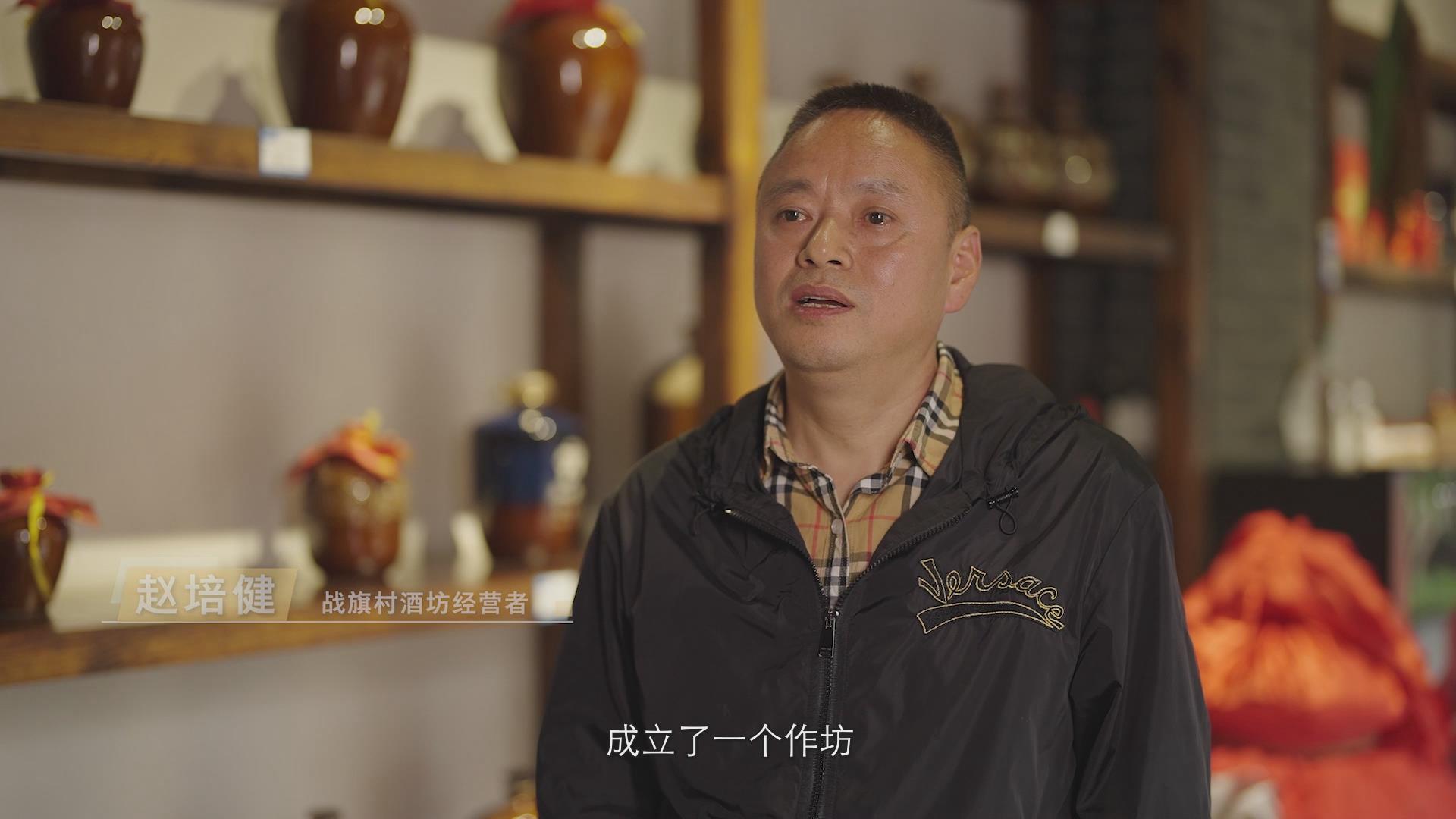 戰(zhàn)旗村酒坊經(jīng)營者趙培健:“從浙江紹興回到我們戰(zhàn)旗村,把我們戰(zhàn)旗村原來傳統(tǒng)的手工制作釀酒這塊成立了一個作坊。”
