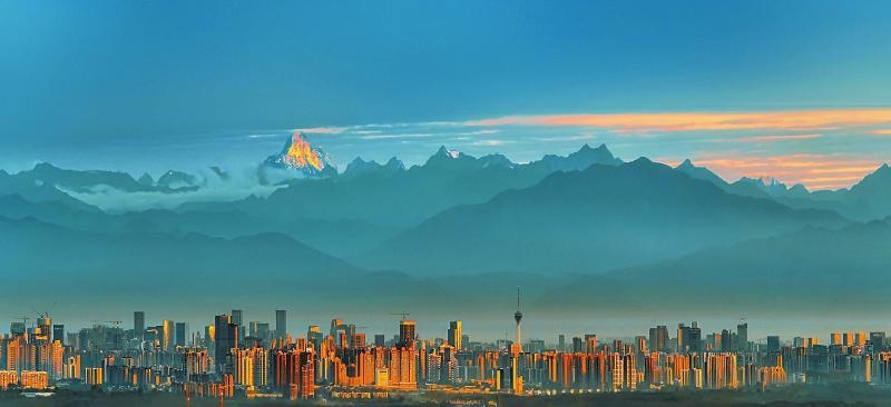 2020年7月26日,攝影師在距離成都市天府廣場60公里的龍泉山拍攝的成都市區(qū)和阿壩州小金縣四姑娘山幺妹峰,展現(xiàn)出“窗含西嶺千秋雪”的美景。
