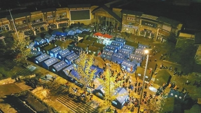 2022年9月5日,瀘定6.8級地震發(fā)生當(dāng)晚,瀘定縣磨西鎮(zhèn)貢嘎廣場的臨時安置點燈火通明??吹剿{色帳篷上的黨旗,群眾的心就穩(wěn)了。四川在線記者 吳聃/攝