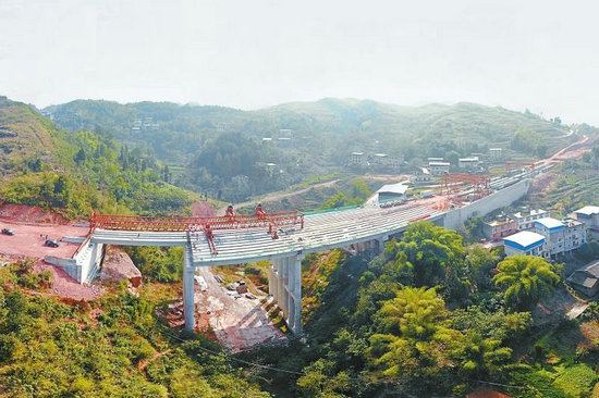 10月17日,川渝高竹新區(qū)南北大道三期鄰水段,正在進(jìn)行預(yù)制T梁架設(shè)的寶竹寺大橋。 吳迪 攝
