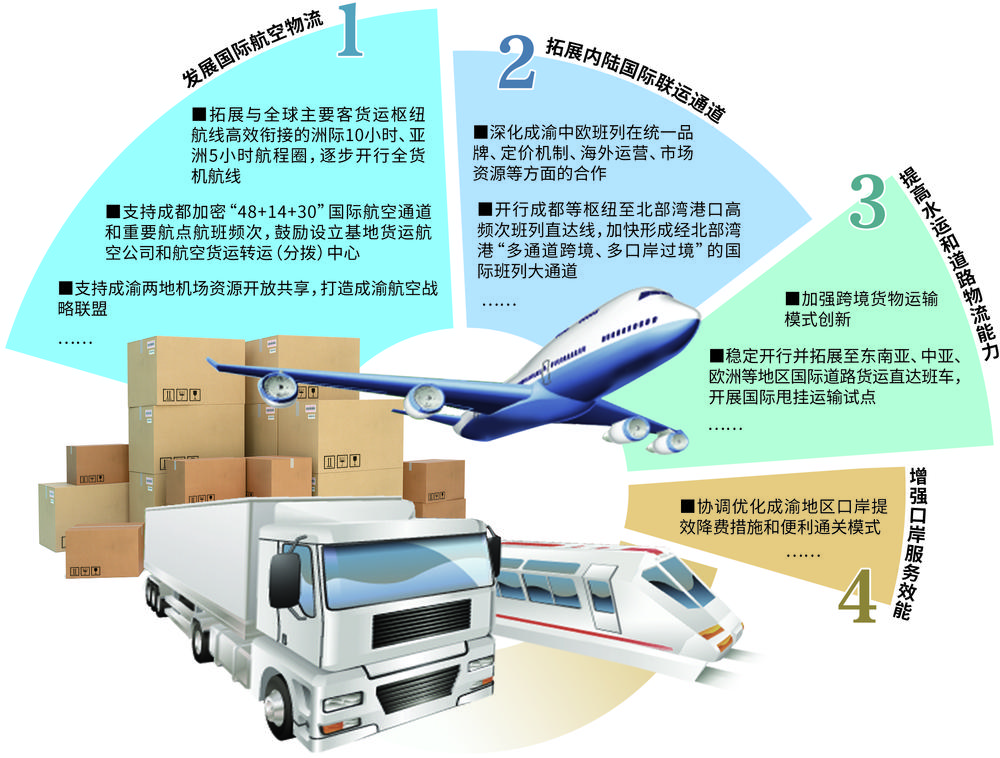 發(fā)展國際航空物流。優(yōu)化國際航線網(wǎng)絡,拓展與全球主要客貨運樞紐航線高效銜接的洲際10小時、亞洲5小時航程圈,逐步開行全貨機航線。支持成都加密“48+14+30”國際航空通道和重要航點航班頻次,落實航空貨運樞紐建設扶持政策,鼓勵設立基地貨運航空公司和航空貨運轉運(分撥)中心。支持成渝兩地機場資源開放共享,統(tǒng)籌運力、整合航線,提升國際航空中轉能力,共營卡車航班,互為異地貨站,打造成渝航空戰(zhàn)略聯(lián)盟。