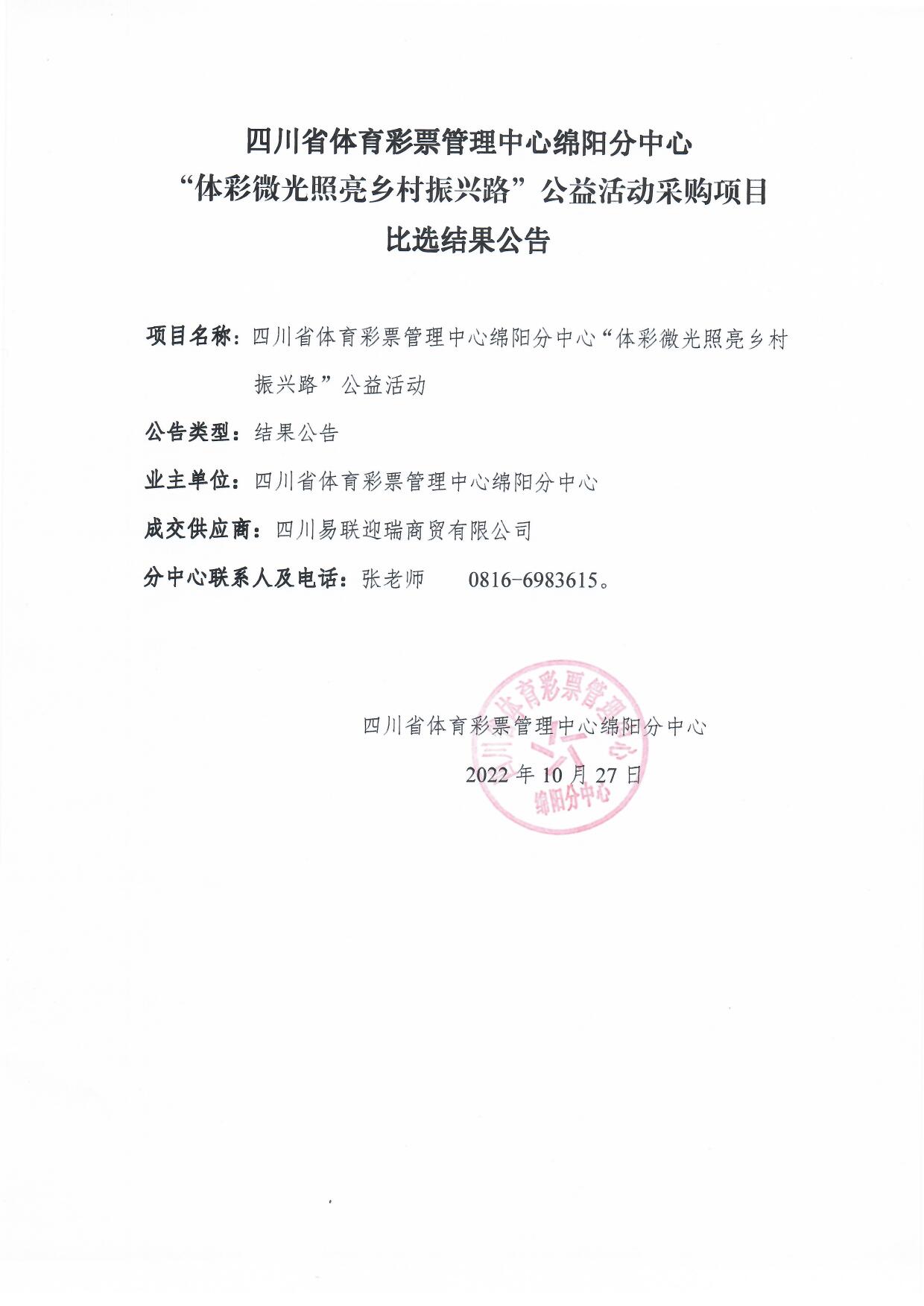四川省體育彩票管理中心綿陽分中心“體彩光照鄉(xiāng)村振興路”公益活動采購項目比選結果公告