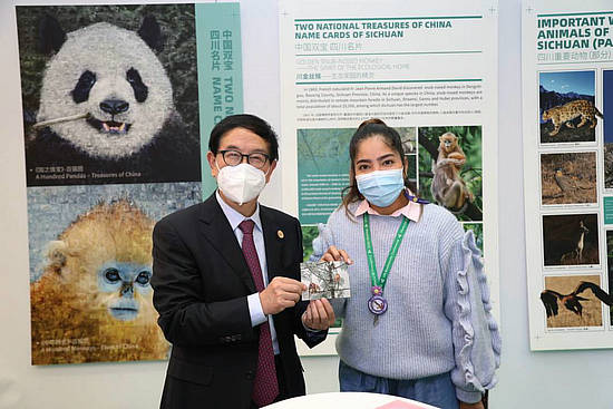 而在另一邊,成都大學(xué)中國(guó)雙寶文化研究中心主任薛康,正在展示自己以生態(tài)環(huán)保和傳播友誼為主線創(chuàng)作的作品。出行前,他往行李箱中塞進(jìn)了十幾本精美的明信片冊(cè)子,內(nèi)容全是大熊貓和金絲猴的圖片,在他心中,這樣的交流推廣早已成為習(xí)慣。