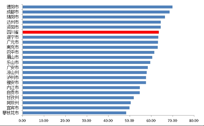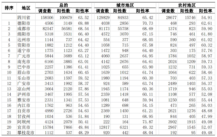 除攀枝花市、宜賓市外,其他19個(gè)地區(qū)感染率均超過(guò)50%,感染率排前五位的為德陽(yáng)市、成都市、綿陽(yáng)市、達(dá)州市和資陽(yáng)市。