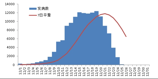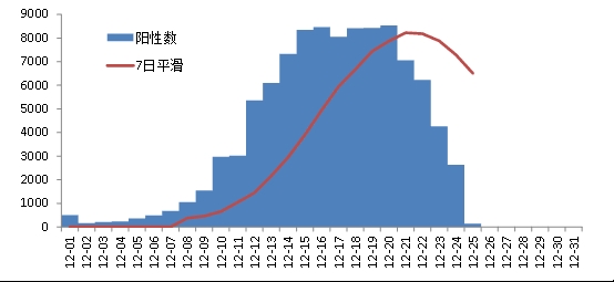 根據(jù)居民自填的核酸或抗原檢測(cè)陽(yáng)性時(shí)間分布來(lái)看,全省陽(yáng)性檢出的高峰期集中在12月12日~23日,目前日新增感染已處于回落階段。從居民癥狀出現(xiàn)時(shí)間分布來(lái)看,癥狀首次發(fā)生在12月10日開(kāi)始上升,24日已降至8~9日水平,新發(fā)癥狀回落更早,其時(shí)間趨勢(shì)較病毒檢出時(shí)間要早2日左右。