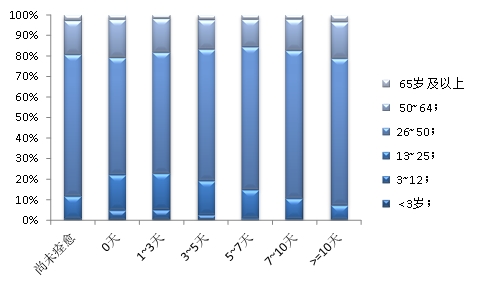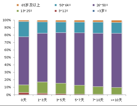 從年齡分布來(lái)看,25歲以下人群病程在3天以內(nèi)比例略多,其他年齡段病程比例分布較接近,與持續(xù)咳嗽時(shí)間結(jié)果相似,65歲及以上老年人病程大于10天的比例更高。