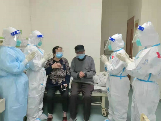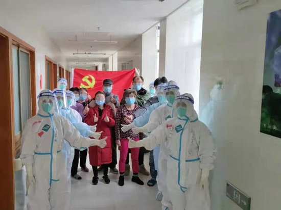 2月5日,2名治愈患者在出院前與醫(yī)護(hù)人員告別。(西安市胸科醫(yī)院供圖)
