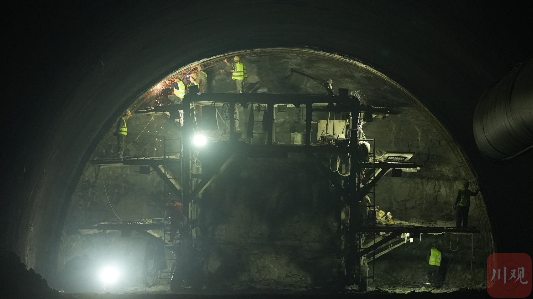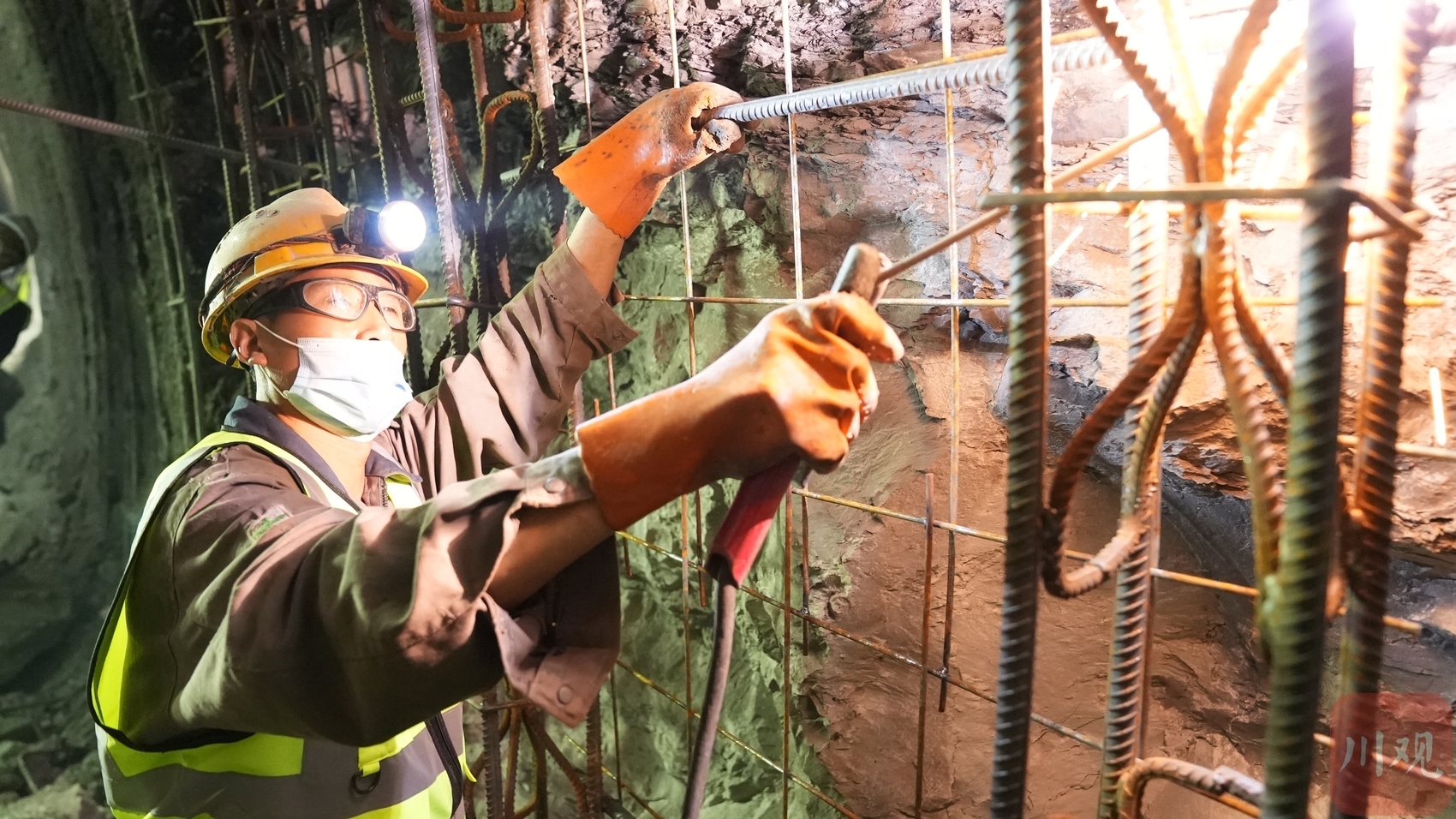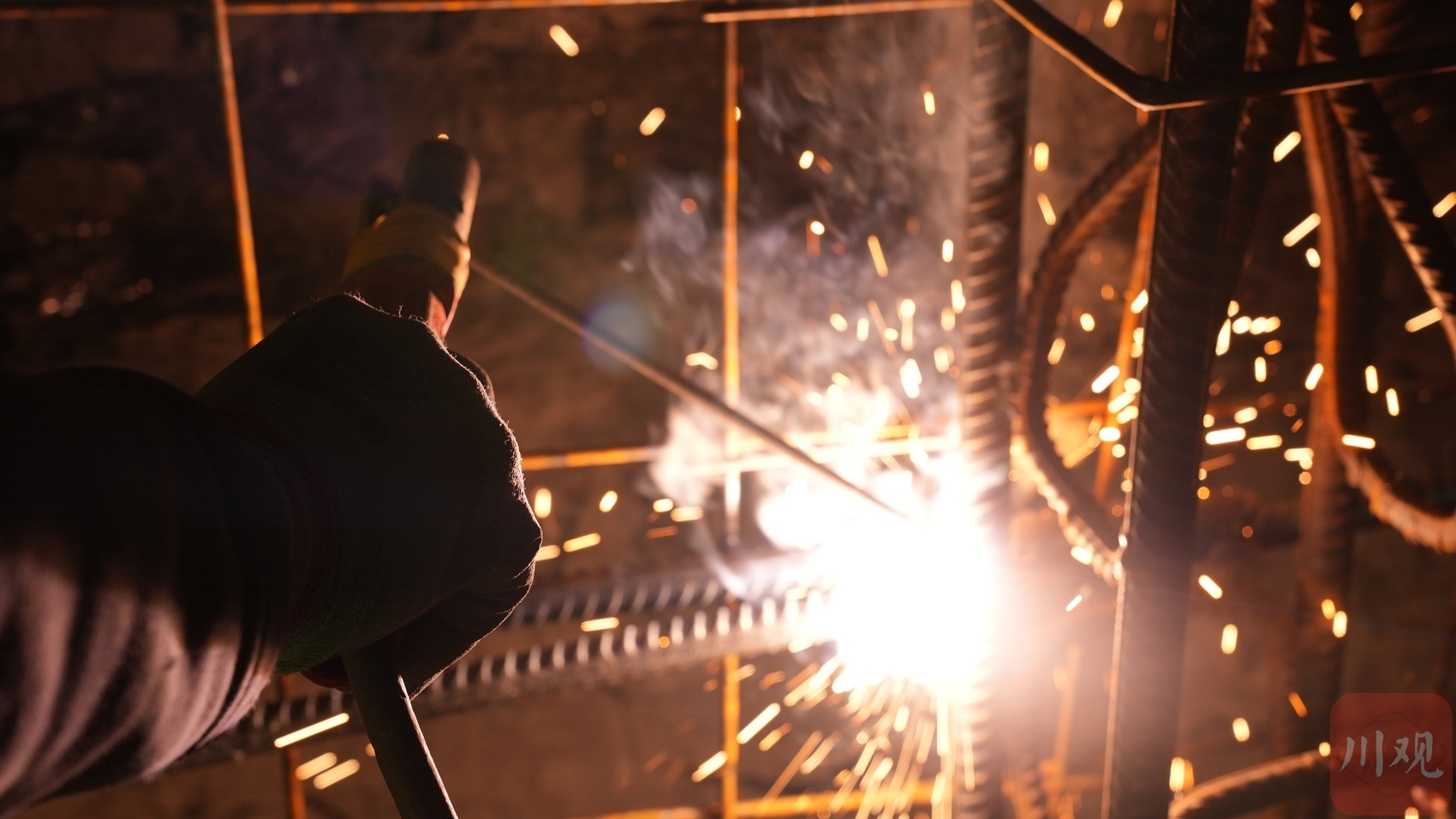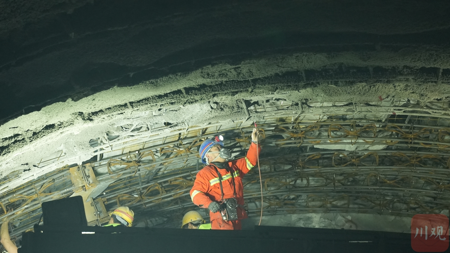 說話間,一輛挖掘機(jī)搭載著弧形的連接筋前來,幾名工人上前抬起連接筋,放置到臺(tái)車底部。臺(tái)車頂部,在技術(shù)人員的指導(dǎo)下,連接筋拼接成型,電焊工開始工作,火花從高處滾落,分外好看。身穿紅色制服的瓦檢員趙德裕站在旁邊,一直監(jiān)測(cè)記錄著異常氣體的數(shù)值。