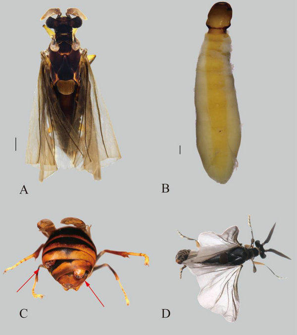 圖為楊氏胡蜂(蟲(chóng)旁加扇)成蟲(chóng)及其寄主黃腳胡蜂。中國(guó)科學(xué)院昆明動(dòng)物研究所供圖