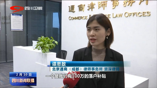 北京通商(成都)律師事務(wù)所資深律師 譚思敔:給我們提供了比較多的優(yōu)惠政策。一個(gè)是我們有100萬(wàn)的落戶(hù)補(bǔ)貼。還有就是房租減免。這些都對(duì)我們企業(yè)來(lái)說(shuō)是非常利好的事情。