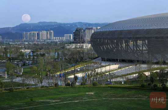 3月17日,一輪皓月從成都大運(yùn)會(huì)主場(chǎng)館旁升起。華小峰 攝(二次曝光圖)