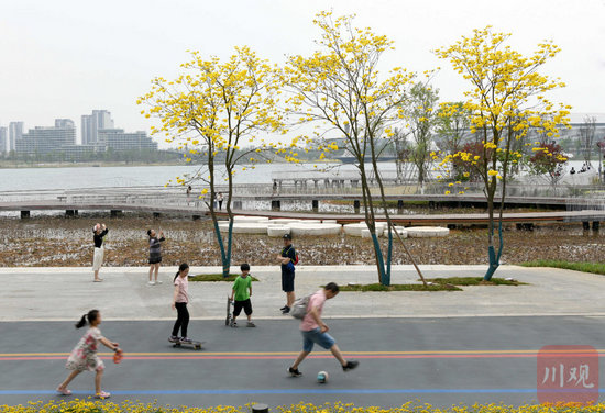 東安湖沿湖綠道旁的黃花風(fēng)鈴開得正盛,人們?cè)诼?、滑滑板、踢足?hellip;…來公園里運(yùn)動(dòng)正成為成都的一種新時(shí)尚,是這座公園城市當(dāng)下最具活力的表達(dá)。
