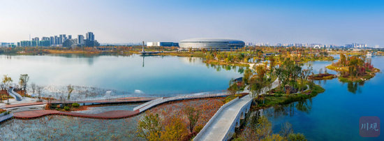 成都鳳凰山體育公園是成都大運(yùn)會(huì)的核心場(chǎng)館,它旁邊的九道堰濕地公園搭建有全域海綿河湖體系,全面改善流域水生態(tài)環(huán)境。