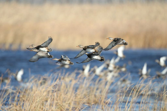 幾只赤膀鴨在野鴨湖飛翔。(受訪者供圖)