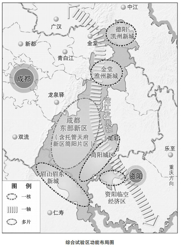 根據(jù)《方案》,試驗(yàn)區(qū)范圍包括:成都東部新區(qū)( 含托管天府新區(qū)簡陽片區(qū)) 和德陽凱州新城、金堂淮州新城、簡陽城區(qū)、資陽臨空經(jīng)濟(jì)區(qū)、眉山眉東新城,面積2997平方公里,2020年末常住人口148萬人、地區(qū)生產(chǎn)總值824億元。