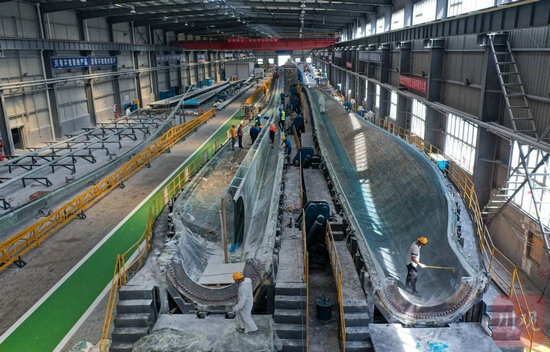 3月11日,記者走進(jìn)東方電氣風(fēng)電(涼山)有限公司的風(fēng)電葉片生產(chǎn)車間,這里擺放著一扇長(zhǎng)約85米的巨型葉片模具,數(shù)十名工人正有序地檢查、修理打磨結(jié)合面,接下來(lái)經(jīng)過(guò)合模、鉆孔等步驟即可將風(fēng)電葉片灌注成型。