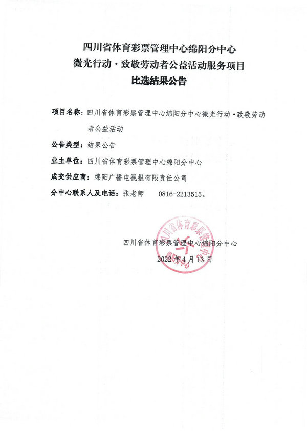 四川省體育彩票管理中心綿陽(yáng)分中心微光行動(dòng)?致敬勞動(dòng)者公益活動(dòng)服務(wù)項(xiàng)目比選結(jié)果公告
