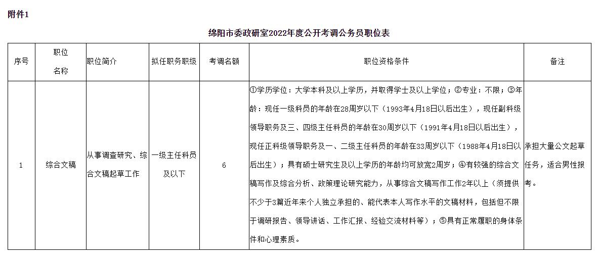 附件:1.綿陽市委政研室2022年度公開考調(diào)公務(wù)員職位表