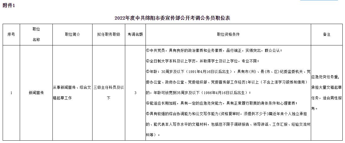 本次公開考調(diào)公務員3名,具體職位信息和要求詳見《2022年度中共綿陽市委宣傳部公開考調(diào)公務員職位表》(附件1)。
