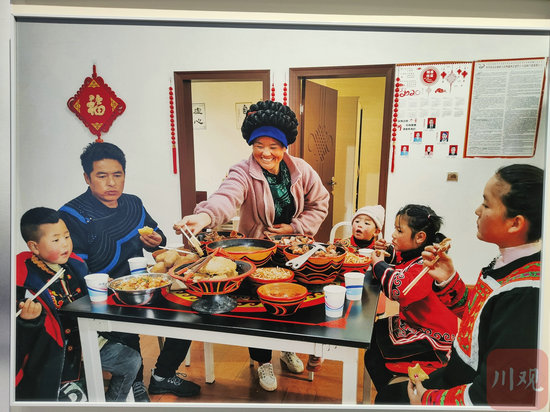 在一樓展廳轉(zhuǎn)角處,是火普村村民吉地爾子一家的新居場(chǎng)景。該場(chǎng)景還原了他家廚房的情況,掛滿了臘肉、香腸,鍋里有剛蒸上的臘肉、香腸、土豆和蕎饃饃。馬天告訴記者,火普村是易地扶貧搬遷的彝家新村,2018年實(shí)現(xiàn)整村脫貧退出,群眾住上了新房子,生活條件得到了很大改善。