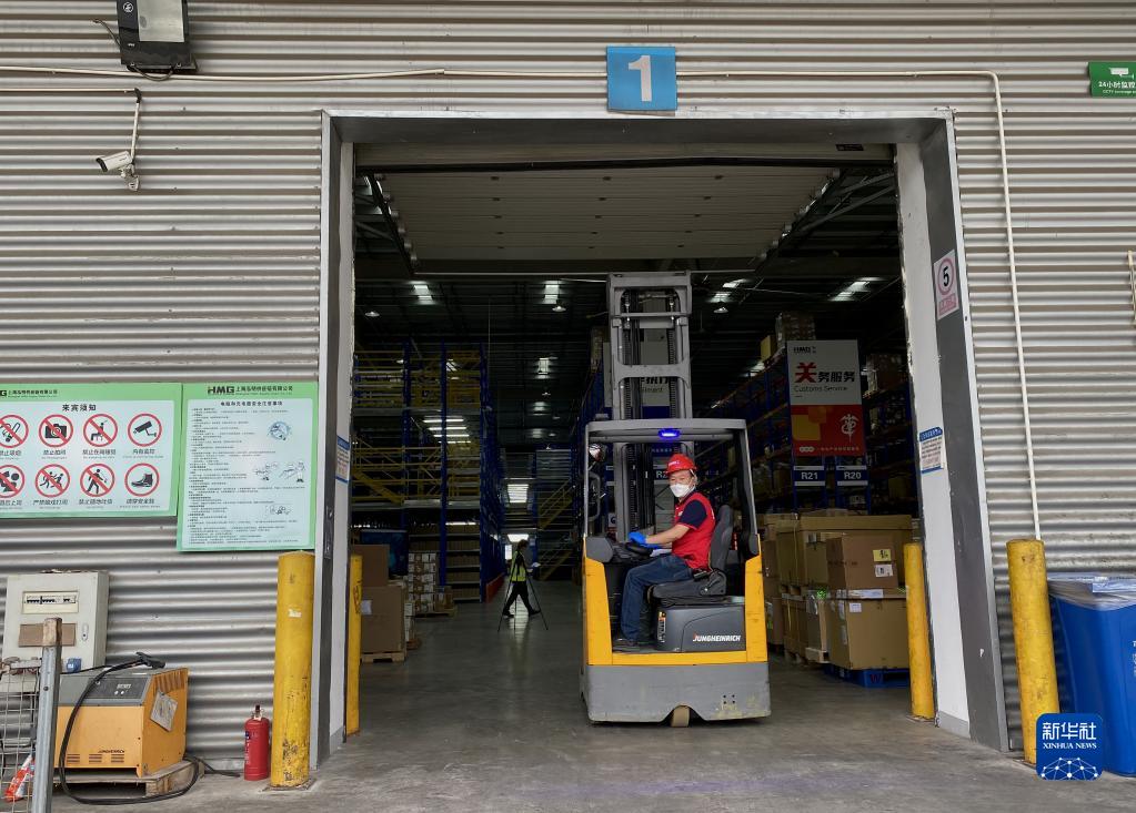 5月20日,在上海泓明供應(yīng)鏈分撥中心,工人開動叉車運送進(jìn)口的集成電路零部件。