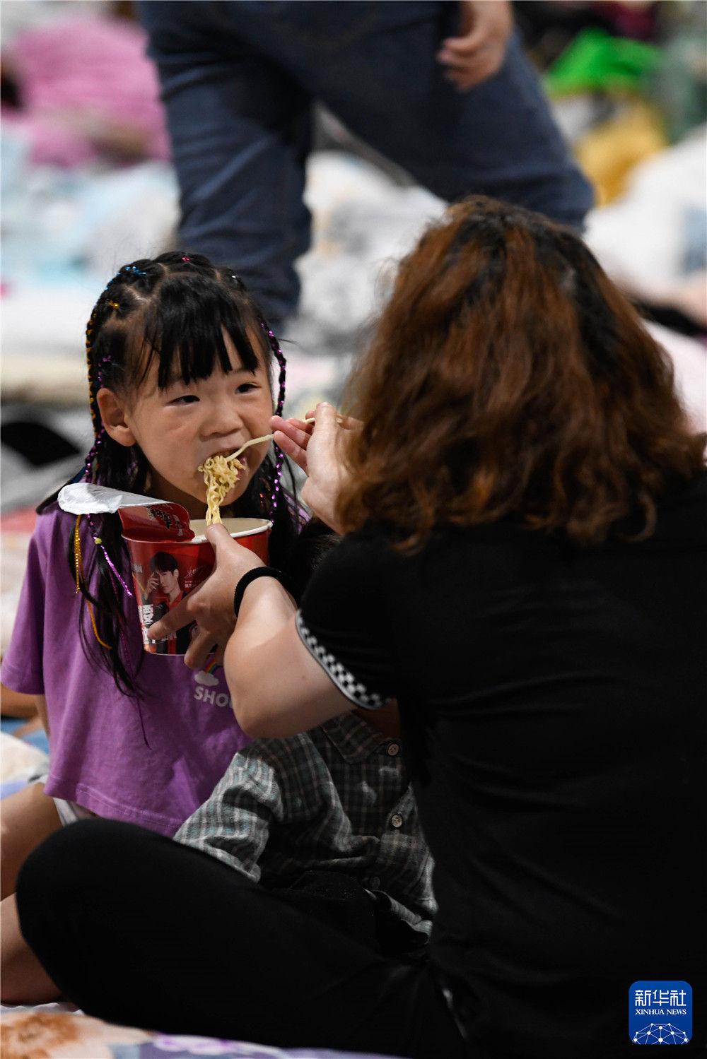 6月2日凌晨,群眾在四川雅安市寶興縣體育館安置點內(nèi)吃面。新華社記者 胥冰潔 攝
