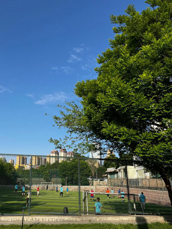 5月24日,蘭州市民在藍(lán)天下踢足球。新華社記者張玉潔 攝