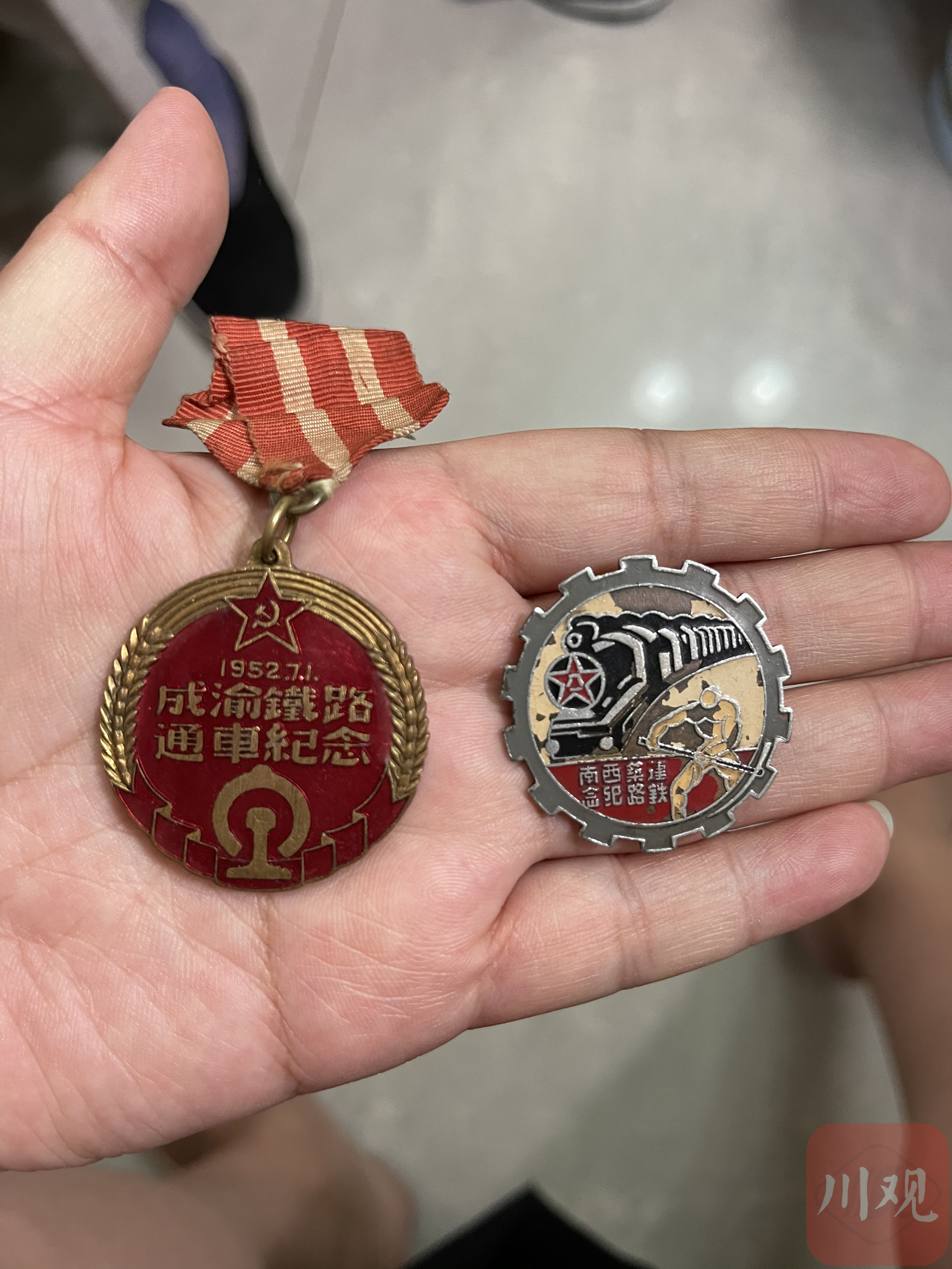 孫貽蓀的兩枚成渝鐵路建設(shè)紀(jì)念章,左為通車紀(jì)念章,右為筑路軍工紀(jì)念章。王眉靈 攝