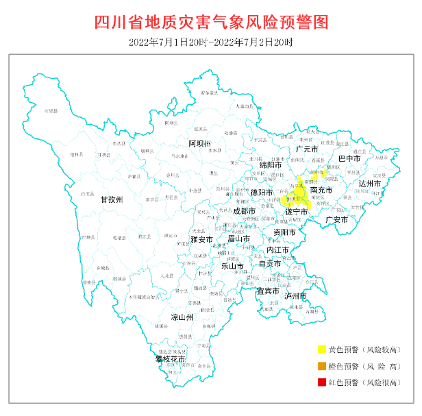 7月1日17時,根據(jù)四川省地質環(huán)境條件,結合四川省氣象臺天氣預報情況,省地質災害指揮部辦公室發(fā)布地質災害氣象風險黃色預警,涉及3市9縣(市、區(qū))。