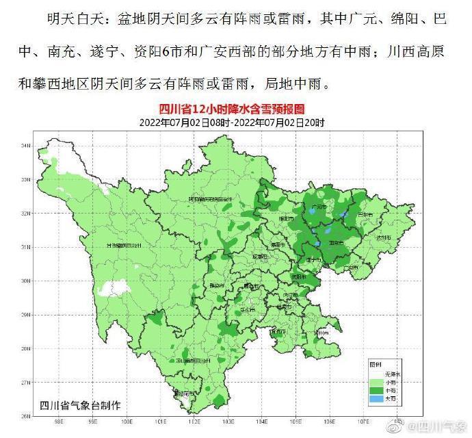 另據(jù)四川氣象官方微博發(fā)布最新天氣預報信息,今天晚上到明天白天:盆地陰天間多云有陣雨或雷雨,雨量小到中雨,其中巴中、南充、遂寧、資陽4市和廣元、綿陽、德陽、內江、自貢、宜賓6市東部以及廣安西部、瀘州北部有大雨,個別暴雨;川西高原和攀西地區(qū)陰天間多云有陣雨或雷雨,局地中雨。24小時內,盆地最低氣溫:22~24℃;最高氣溫:29~31℃。