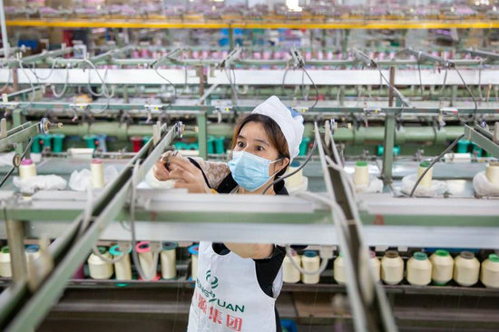 6月15日,江蘇省海安市高新區(qū)一絲綢紡織企業(yè)車間內,工人在生產線上忙碌。新華社發(fā)(翟慧勇 攝)